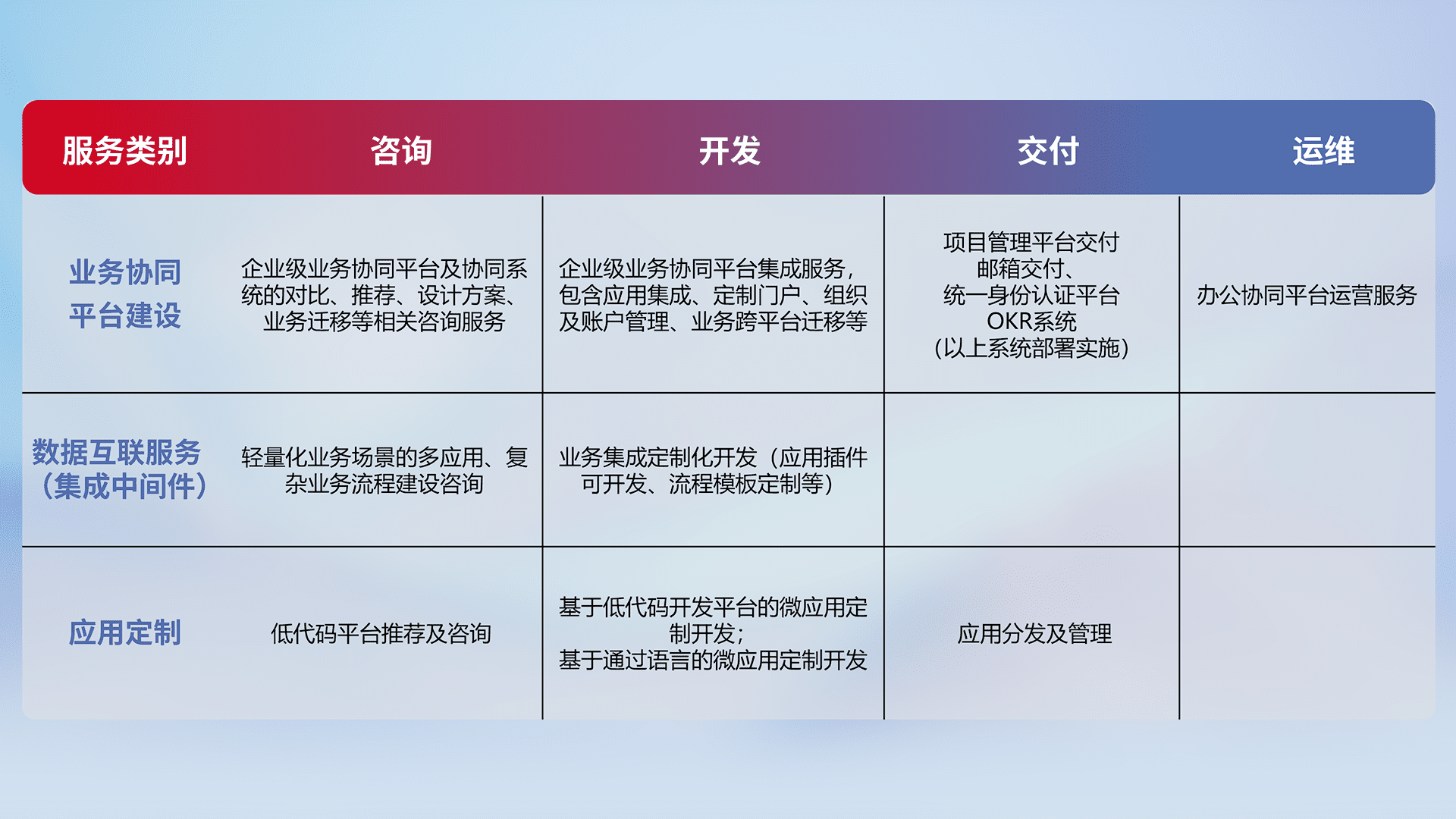 针对钉钉、、、、企微、、、、IDaas等平台级产品提供产品的规划、、、方案、、交付、、定制化开发等服务,,,实现如统一协同办公、、智能客户服务、、混合会议管理、、、、智能数据查询、、、、等业务场景,,,实现数字化转型。。。
