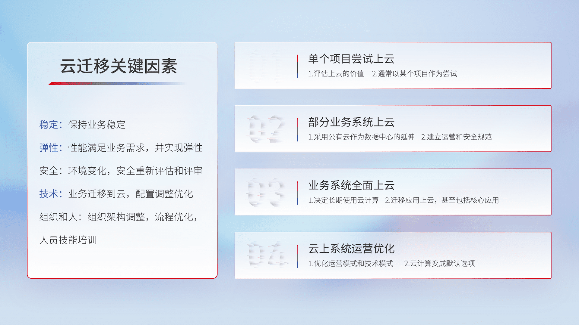 结合实际业务,,,从规划设计、、云平台选型、、云原生改造、、数据迁移、、、集成交付,,,迁移全过程为客户识别最佳上云路径,,,,做好风险识别管理,,设计网络架构、、、身份权限、、安全审计合规、、、、操作审计、、日志审计、、、、监控告警策略、、、、多站点容灾设计等,,,对云上基础设施进行整体规划,,,,提升IT治理水平,,以满足弹性、、、、高可用、、高性能的需求。。