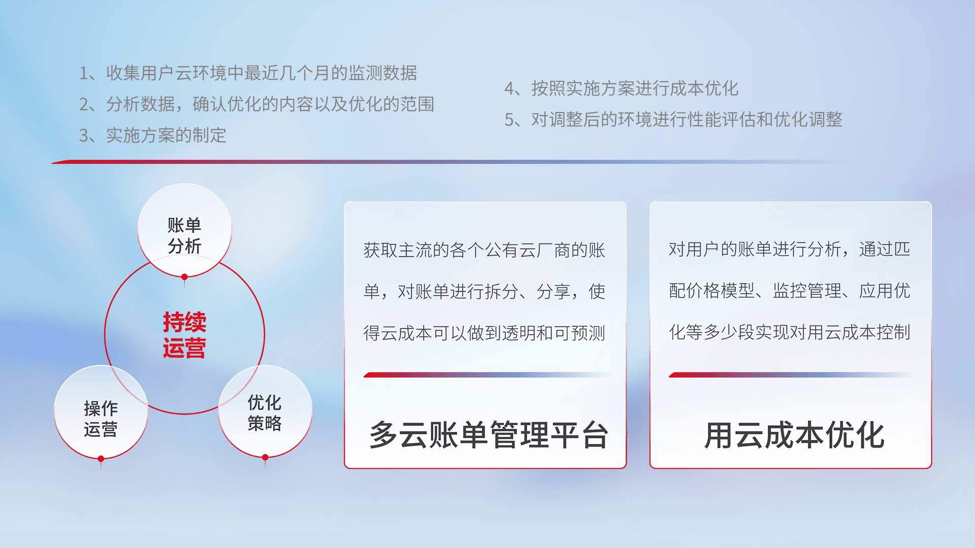 通过多云纳管,,,以统一的资源数据模型把客户的云资源进行抽象和封装,,,进而实现对多云资源的统一操作,,,,保障云资源管理的可靠性、、、稳定性与可用性。。量身定制化运维内容,,,,配置、、、开发运维、、、、补丁管理、、备份、、、监控、、认证和访问管理、、审计和日常巡检等,,保障在用云过程中的可靠度,,稳定度以及高可用率。。